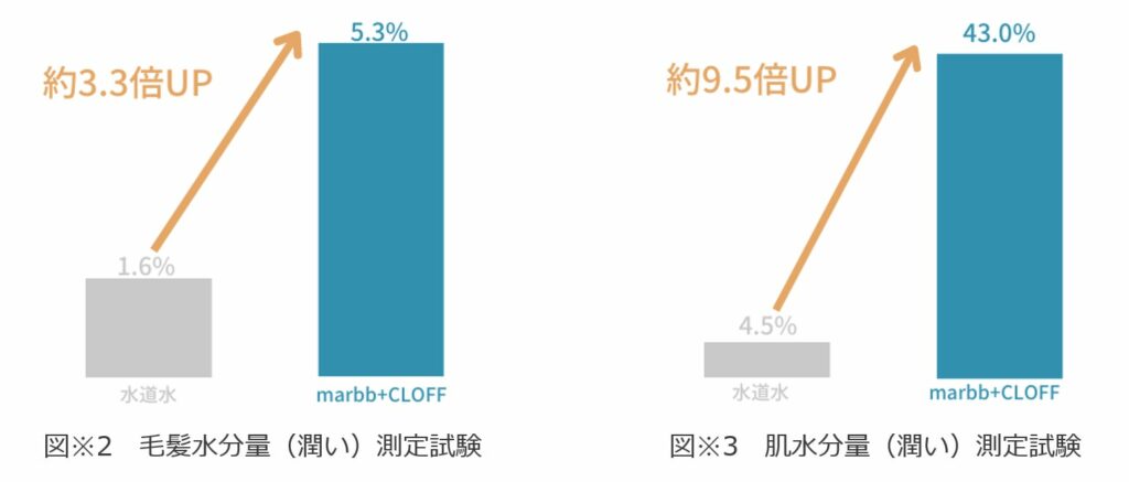 marbbとCLOFF by marbbを併用した場合、水道水と比べて毛髪水分量(潤い)上昇率が約3.3倍に上昇することが確認できています。また、肌水分量(潤い)上昇率は、marbbとCLOFF by marbbとの併用により、水道水と比べて約9.5倍に上昇することが確認できています。