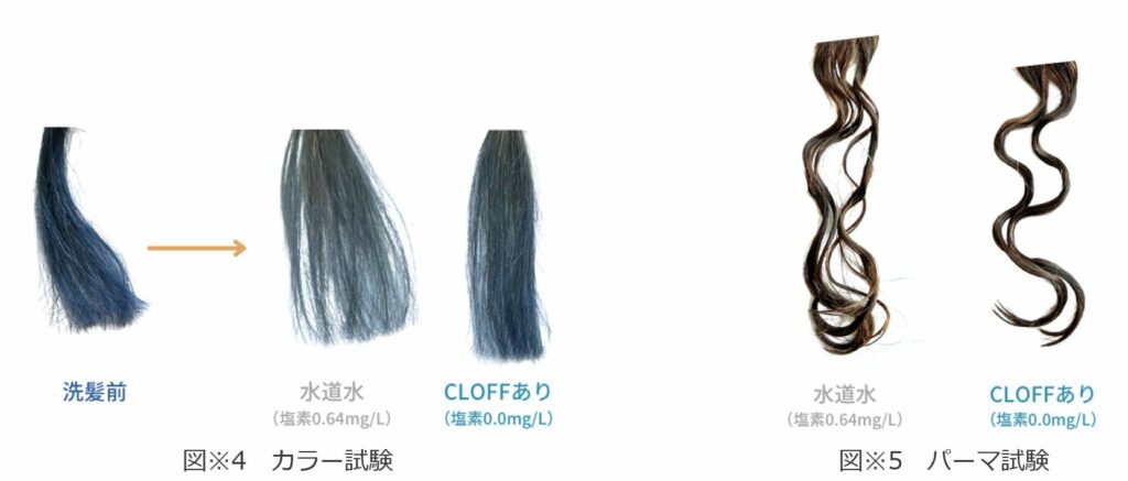 水道水とCLOFF by marbb使用時のカラーの褪色度合いを実験した結果、水道水と比べてCLOFF by marbb使用時の方が褪色を抑えられ、手触りが良くなることを確認しました。また、水道水とCLOFF by marbb使用時のパーマのかかり具合を実験した結果、水道水と比べてCLOFF by marbb使用時の方が、パーマのリッジが出てしっかりとしたカールを表現できることを確認しました。