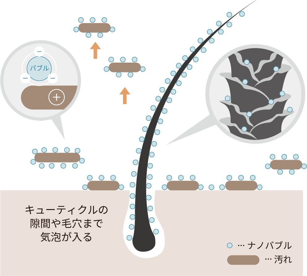 超微細気泡だからこそ、キューティクルの隙間や毛穴に入り込み、通常のシャンプーでは落ちにくい、皮脂汚れや残留シャンプーを除去できます。