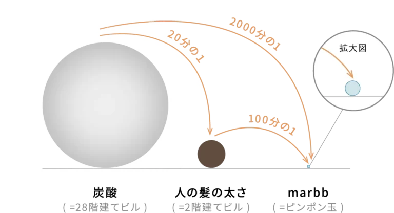 marbbのナノバブルは最小径0.5μm (マイクロメートル) という、炭酸の約1/2000のサイズの超微細な気泡です。
