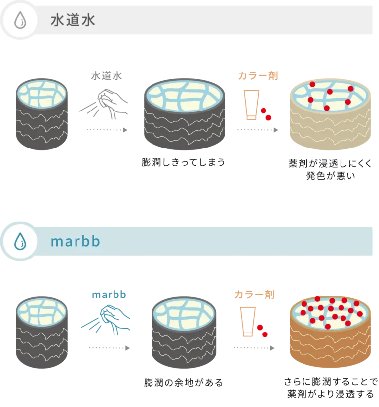 トリートメント剤・カラー剤・パーマ剤などの効果を引き出すには、まず髪の汚れや残留物を落とすことが大切です。施術前にmarbbで予洗いをすることで薬剤の浸透を助けます。さらに、marbbは髪に必要以上の水分を与えないため、毛髪の内部に薬剤が浸透する余地ができ、美しい発色やカールなど、より良い仕上がりが期待できます。