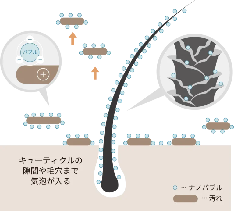 バブルは髪の毛よりもはるかに小さく、汚れを吸着して除去する特徴があります。超微細気泡がキューティクルの隙間や毛穴に入り込み、通常のシャンプーでは落ちにくい余分な皮脂汚れや残留シャンプーを除去します。